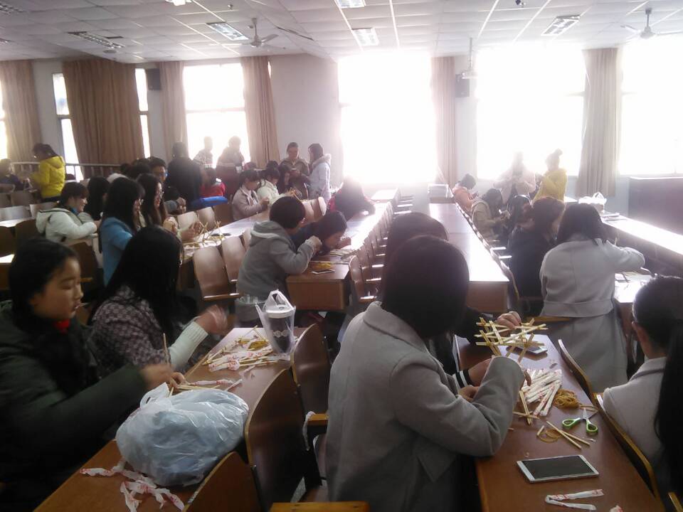 选手们在听清赛事规则之后,纷纷摩拳擦掌迫不及待地投入到筷子拼搭制作中去。“先做三脚架,然后再拼起来作底盘…”来自英语151的范素婷与同伴商量着模型的结构,还时不时拿着筷子比划着。他们绑皮筋,搭筷子,剪胶带,动作敏捷,配合默契,不禁让一旁的同学惊叹:“简直像是流水线一般!”不一会儿底层便展露雏形。一个半小时的比赛时间一晃便过去了,竹蜻蜓式,六角罗盘式,拱形横桥式…千奇百怪的形状在选手们的手指尖悄然绽放。